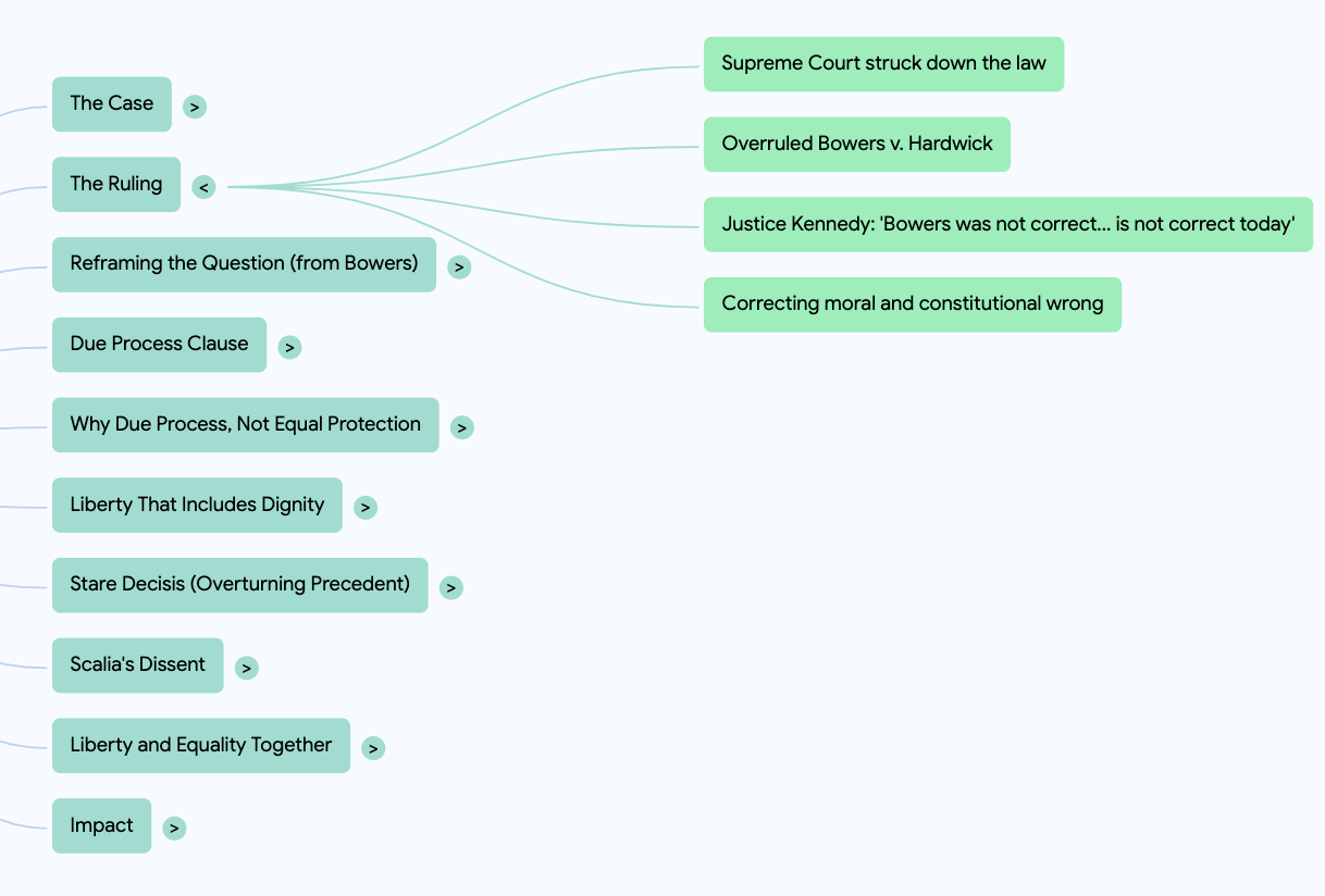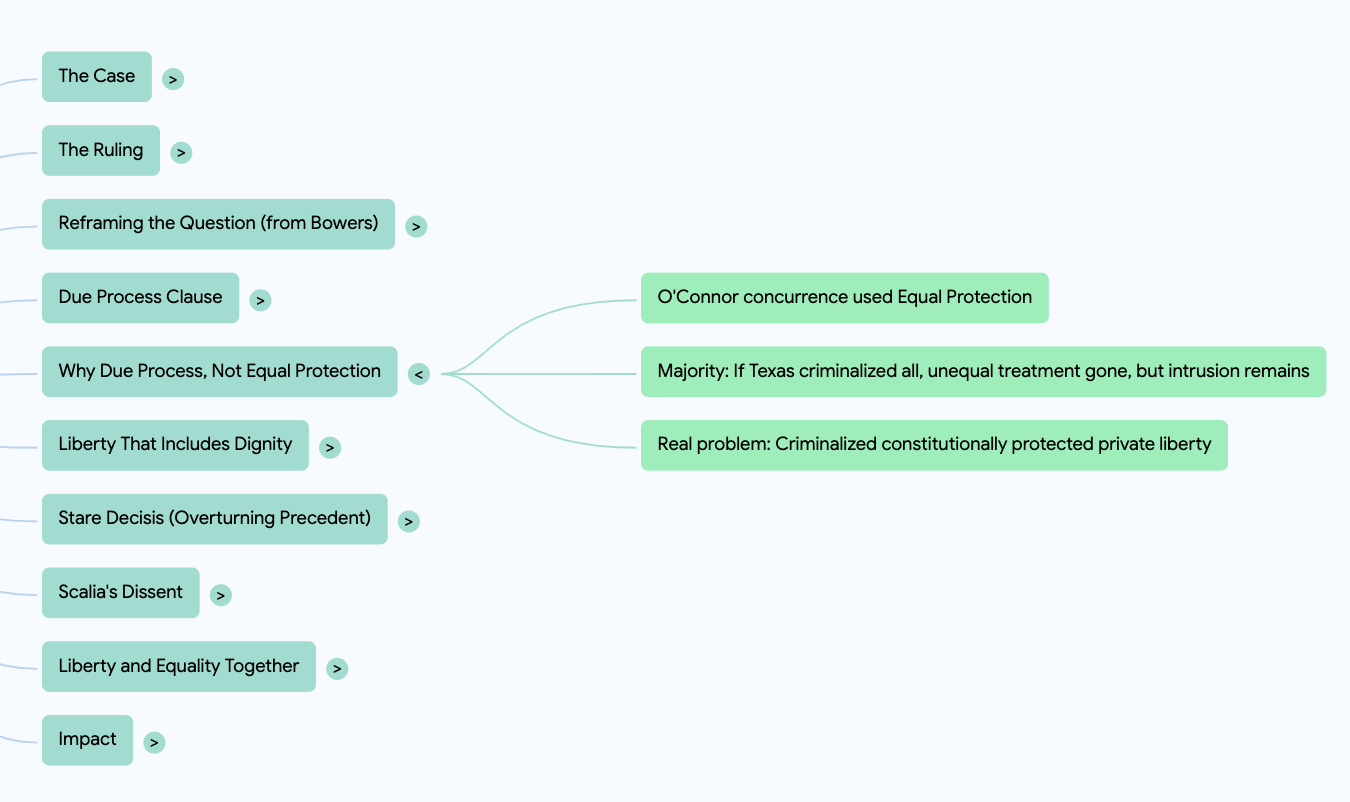 So the Court used substantive due process. It said the real problem was not that the law treated people differently, but that it criminalized something the Constitution protects: the private liberty to make personal decisions about intimacy.